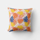 Een levendig en kleurrijk ontwerp met grote tropische bladeren in de kleuren sinaasappel, geel en blauw. Het patroon wordt aangevuld met abstracte roze achtergronden en verspreide gestippelde accenten, waardoor een dynamische en energieke compositie ontstaat. Dit levendige ontwerp legt de essentie van tropische flora vast met een moderne artistieke twist.