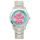 Roze hibiscusbloem op een turquoise, blauw-groene achtergrond, horlogegezicht met vele bandstijlen om uit te kiezen. Dit tropische ontwerp in kleuren is zeker om elke vrouw te behagen.