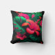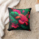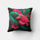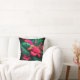 Gooi kussen met illustratie van tropische bloemen en bladeren in kleuren van groen, roze en sinaasappel.