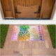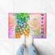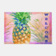 Verwelkom uw gasten in stijl met deze gepersonaliseerde deurmat. Dit ontwerp is voorzien van een ananas met roze achtergrond en een blauw welkomstbord aan de rechterkant. Ontworpen door wereldberoemde kunstenaar ©Tim Coffey.