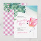 Deze eenvoudige bruiddoucheuitnodiging kenmerkt de moeder om de naam te zijn die in een moderne handgeschreven manuscripttypografie met gebeurtenisdetails in een klassieke serif doopvont wordt geplaatst. Een boarder van mijn oorspronkelijke waterverf roze flamingo en monstera palmbladeren in tinten van blauwen, groene en turquoise voegt deze tropische uitnodiging toe. De kaart keert terug naar een vleiend roze gingham patroon. Een botanische, maar elegante keuze voor casual zomerluaus, tropisch strand en baby showers die aan de kust liggen. Om mijn hele kantoorsuite te zien, bezoek DoTellABelle op Zazzle.