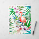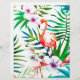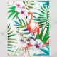 Een tropisch kunstwerk van een roze flamingo en groene tropische oerwouden planten met hibiscus bloemen en palmen tegen een neutrale witte achtergrond. Een leuk en kleurrijk kunstwerk.