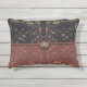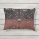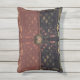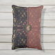 Oude Europese wereld, exotisch en donker, met een lichte smaak van de Oriënt, het prachtige patroon van ZoeSPEAK, in natuurlijke kleuren op dit Accent Pillow, is gemaakt van een originele foto van smeedijzeren latwerk en tropische printstof. Palmbladeren en andere tropische bladeren, in de kleuren bord, terracotta en beige, rusten sierlijk op een zwarte achtergrond achter het latwerk. Het ontwerp is in de stijl van een koppelingszak of handtas, met een bloemige medaillon knoopsluiting op een donkere achtergrond, gladde stofklep over een vervaagde bordeauxrode structuur van hetzelfde patroon. De flap is omzoomd met een zalmroze grosgrain lint.