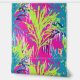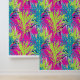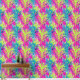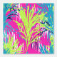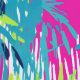 Een naadloos patroon met levendige limoen en staalblauwe palmbladeren op een levendige paarse achtergrond, versierd met zwarte en witte streken. Dit ontwerp lijkt op een handgeschilderd kunstwerk, dat gedurfde tropische elementen combineert met artistieke flair, waardoor een opvallend en exotisch visueel effect ontstaat.