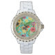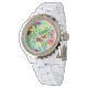 Tropische mix-fruit, bloemen en bladeren op blauw horloge