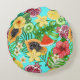 Tropische mix-fruit, bloemen en bladeren op blauw rond kussen