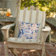 Tropische palmboomafdrukken op blauw van de marine met oranje, taankleurige en babyblauwe strepen, klaar voor jouw naam en monogram, in elke kleur op transparante witte bekleding aan de voorzijde (kan op de lay-out worden verwijderd of bewogen). Creëer voor jezelf of geven als geschenk. Kies BUITEN of BINNEN en van 3 maten.