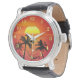 Tropische strandscène met palmbomen, zonsondergang, oceaan en een kruisende hammock tussen twee palmbomen.
