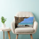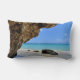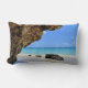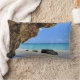 Kussen met een schilderachtig natuur foto. Prachtig turquoise blauw zee met een zandstrand. Een grote bruine rots zorgt voor wat schaduw van de helderblauwe lucht.