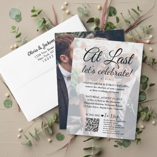 Nodig familie en vrienden uit voor een eenvoudig elegante bruiloftsviering met een stijlvolle moderne "At Last Let's Celebrate" 2 foto all-in-one uitnodiging met QR-code RSVP. Alle tekst is eenvoudig aan te passen voor elk type evenement, inclusief een receptie na een elopement-feestje, hernieuwde beloften-ceremonie, sequel-huwelijk, 1-jarig huwelijksfeest, cocktailuur of dinerfeest. (TIP VOOR PLAATSING VAN DE AFBEELDING: Een gemakkelijke manier om een foto precies te centreren zoals je wilt, is door deze bij te snijden voordat je hem uploadt naar de Zazzle-website.) Door de QR-code te scannen met hun telefoon, worden gasten direct naar de bruiloftwebsite gestuurd om op de uitnodiging te reageren. Een online RSVP-proces verkleint de kans dat kaarten verloren raken in de post. Het is ook veelzijdiger, omdat je om meer gedetailleerde informatie kunt vragen, zoals maaltijdkeuzes, voedselallergieën en muziekwensen. Alle responsinformatie kan worden aangepast of verwijderd. Het moderne minimalistische zwart-wit tekstoverlay-ontwerp bevat twee foto's van het pasgetrouwde stel, trendy handgeschreven kalligrafie en chic schrijfmachine-typografie. Deze uitnodiging is een stijlvolle manier om je bruiloftsgasten te vragen vriendelijk te reageren op je aankomende speciale dagviering. Of je nu bent weggelopen,
