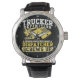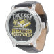 This humorous wall clock provides a witty 'definition' of a truck driver's crucial role. Against a black background with a yellow rim, it features a yellow semi-truck graphic and the bold text: "TRUCKER DEFINITION A PERSON WHO FIXES WHAT A DISPATCHER SCREWS UP". It's a perfect, lighthearted gift for any trucker who often finds themselves solving problems on the road. The design tool can also be used to add custom text if you want your name or company on this clock. You can customize the color of the frame to any color you desire by going into the design tool.