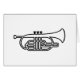 Eenvoudige zwarte en witte lijnillustratie van een trompet. Afbeelding beschikbaar op diverse giften en producten.