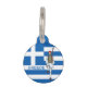 Het Griekse gevechtspictogram van de Evzone (tsolias) met een pistool, met rode fez, fustanella en tsarouchia. Achtergrond van de vlag van Griekenland. De tekst van de douane aan beide kanten.