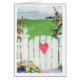 Een blanco briefkaart met een hart op de tuinpoort.
