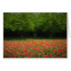 Een prachtig kleurcontrast in de natuur. Koraaltulpen in volle bloei op het Klomp Tulip Boerderij in Woodburn, Oregon, met groene rijen bomen op de achtergrond. Een mooie lentemochtend! Foto genomen in april 2014.