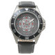 Een concentrische vierkante mandala krijgt het uiterlijk van een tunnel die de kijker aantrekt met een combinatie van schuine lijnen, driehoeken en cirkels in grijstinten, rood en wit tot bijna creëer een optische illusie. Dit horloge is verkrijgbaar in verschillende maten, kleuren en stijlen, waaronder maten voor kinderen en volwassenen.