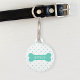 Turquoise / turkooizen kleur kleine stippenpatroon samen met een turkooizen hondenbot silhouet op de voorkant. Op het bot is er een personaliseerbare tekst gebied voor de naam van het huisdier. De achterkant heeft een personaliseerbaar tekstveld voor een telefoonnummer.