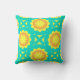 Levendige vormgeving van de draaiende kussens met een naadloos patroon van geometrische vormen in oranje en geel op een turkooisachtergrond.