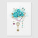 Antiek gouden sleutel met trendy turquoise-rozen versierd met bladeren van wit goud, roze en blauwe kralen. Fashionable kleur. Turquoise rozen. Wit goud. Blauwe tang.