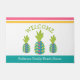 Welkom. Breng een beetje tropische eilandgastvrijheid in je strandhuis met deze chic, moderne doormat. 3 moderne, grafische, turquoise blauwgroen blauw, groen, roze en oranje anananas, roze en oranje strepen, lentegroen handgeschreven typografie, samen met uw familienaam/bericht op een turquoise blauwe band, bedekken een witte achtergrond. Voegt een leuk, feestelijk gevoel toe aan je voordeur! Typ gewoon uw informatie met de gebruiksvriendelijke sjablonen en u kunt deze welkome slaapstand eenvoudig personaliseren. Stuur me alstublieft alle vragen of verzoeken.