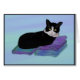 Grafische illustratie van Tuxedo de Kat die op werpkussens tikt.