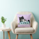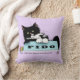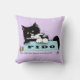 Schattigee zwart-witte smoking kitten zittend in een blauwe hondenkom tegen een achtergrond van paarse.
