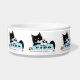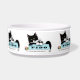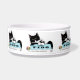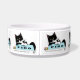 Schattigee zwart-witte smoking kitten zittend in een blauwe hondenkom tegen een achtergrond van paarse.