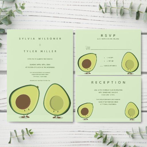 Een foodie bruiloft uitnodigen met een vleugje plezier. Laat je vertegenwoordigen door twee gelukkige avocado illustraties, die diep verliefd zijn. Deze uitnodiging combineert een grillige vreugde met genoeg elegantie dat u uw bruiloft kunt ontwerpen zoals u wilt. De uitnodiging wordt gedaan in een groene tint. Plaats uw namen en informatie op deze uitnodiging, voeg deze toe aan uw winkelwagen en heb een prachtige bruiloft.