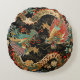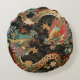 Dit ronde kussen heeft twee Aziatische stijldraken omgeven door bloemen op een zwarte achtergrond.
