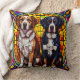 Kleurrijke glas-in-loodramen beeltenis van twee honden zitten tegen een levendige geometrische achtergrond met ingewikkelde details en stralende verlichting.