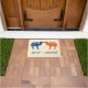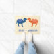 Veeg je hoeven of je voeten, zoals het hoesje kan zijn, in stijl af op deze gepersonaliseerde camel deurmat. Deze welkomstmat is ideaal voor koppels en is voorzien van cartoon-stijlillustraties van bacteriaanse of tweevoetige kamelen in sinaasappel en blauw met uw namen of een ander bericht hieronder in het blauw.
