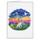 Een ster schijnt neer op een Blenheim Cavalier King Charles Spaniel die geniet van het schemerlicht terwijl de zon begint te schijnen, de maan stijgt in de hemel van ronddraaiende kleuren en een duif overloopt.