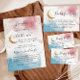Droomsterren en maanthema gender onthullen welkome banner met de hemel in waterverf blauw en roze met faux gouden glitter sterren en maan. In de tekst staat: "Kronkel kleine ster om je af te vragen wat je bent!"