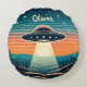Dit opvallende gepersonaliseerde ronde kussen beschikt over een scène van een ufo die door een betoverende zonsondergang zweeft. Sterren twinkelen in de donkere bovenhemel, terwijl de vurige oranje horizon een dramatisch silhouet werpt op het landschap eronder. De UFO zelf fungeert als een baken, dat het land verlicht met zijn felle licht.