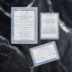 Het ontwerp biedt een mooi blauw en grijs gekleurd "marbling" effect als achtergrond voor de vorm die jouw tekst weergeeft. De eerste initialen van bruid en groom worden elegant getoond op hoogste centrum. Het uiterlijk van gevoelige linten bedekt het ontwerp. De omgekeerde zijde heeft hetzelfde marmereffect met het afbeelding van zowel lint als rijst. De tekst is die van de traditionele katholieke bruiloft en is volledig aanpasbaar. Design maakt deel uit van de "Blue and Grey Marble" trouwsuite.
