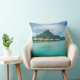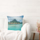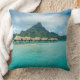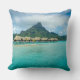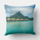 Gooi een kussen van een luxe bovenwater dat het dak bungalow in een vakantieoord in de heldere blauwe lagune heeft gestort met een uitzicht op het tropische eiland Bora Bora, bij Tahiti, in Frans-Polynesië.
