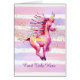 Sweet fantasy thema voor kleine meid beschikt over een roze waterverf Eenhoorn met lavendel en paarse accenten. Pastel waterverf streep achtergrond in bijpassende tinten met geprint goudstof.
