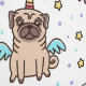 Afbeelding van Viaire | Shutterstock. Afbeelding-ID: 739407121 | Dit schattige patroon kenmerkt een hond van het pug-ras in een eenhoornkostuum met vleugels en regenbooghoorn.