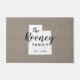 Moderne boerenboerengepersonaliseerde doormat met je familienaam in je staatskaart. Faux burlap canvastextuurachtergrond. Klik op Aanpassen om uw eigen tekst en afbeeldingen toe te voegen en een uniek ontwerp te creëer!