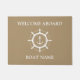 Het ontwerp van de standaard bootschotel "Welcome Aboard" biedt een eenvoudig, stijlvol crème en een witte kuststijl met een bootankeraccent. Pas de aangepaste tekst aan met de naam van uw boot, samen met de plaats waar u zich bevindt en de staat waarin u zich bevindt.