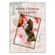 Een grappige kerstkaart waarop een calicaanse kat op achterpoten staat en speelt met een rode ballversiering op een kerstboom. Binnen is de kaart een afbeelding van een kat met een Santa Hat. Een leuke kaart om naar katten liefhebbende vrienden of familie te sturen.