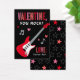 "Valentijn, You Rock"-Valentijnsdagen ontworpen voor coole kinderen die graag roteren en rollen! Een platte kaart is voorzien van een rood elektrisch gitaar en een sterrenpatroon met accenten voor hart- en muzieknotities en aangepaste naamtekst op zwarte achtergrondkleur.