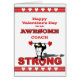 Valentijnsdag wenskaart voor een coach. Een spierpinguïn tilt hartgewichten en er wordt een schaduw achter gegoten. Fijne Valentijnsdag naar een Geweldige coach, tekst op de cover. Het elementenbedankt van de pinguïn aan HGomez/Openclipart. Kunst, afbeelding en vers copyright © Shoaff Ballanger Studios.
