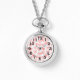 Dit vrouwenhorloge heeft een moderne Valentijn uit het midden van de eeuw van verspreide rode hartmazen op een gebied van wit.