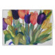 Blanco briefkaarten en wenskaarten met deze tulpbloemen in rood, oranje, geel, blauw en paars. Gemaakt van een origineel schilderij van de waterverf.