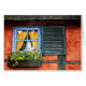 De rode muren en het blauwe venster lijst maken tot dit halve timbered huisje met een gestoord dak een kleurrijke groet voor uw vrienden. Reproductie van een schilderij van de oorspronkelijke waterverf