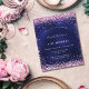 Een moderne, stijlvolle en glamoureuze uitnodiging voor een 21e (of elke leeftijd) verjaardagsfeestje. Een marineblauwe achtergrond, versierd met roze confetti. De blauwe kleur is ongelijk. Personaliseer en voeg jouw namen en partijgegevens toe.