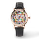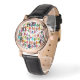 Het horloge van deze vrouw heeft een modern design uit de midden van de eeuw van sets van drie bladeren in vervaagde tinten van retrokleuren.