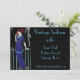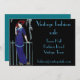 Een flyer of reclame voor een tweedehandse kledingverkoop. Deze volledig aanpasbare flyer advertentie-uitnodiging is voorzien van een zwarte achtergrond met een Art Deco-achtige mode-dame in de jaren 20 van de vorige eeuw, een blauwe, modieuze jurk met blauwe aanpasbare tekst.