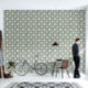 Originele digitale waterverf schilderij op dit behang bootst het uiterlijk van oude klei tegels in tinten van bot wit en aqua aangelegd in een dambordpatroon, en elk w / a verschillende vervaagd handgeschilderde botanische afbeelding zoals witte hortensia, bleke roze rozen, orchideeën, en verschillende vederachtig groen.
